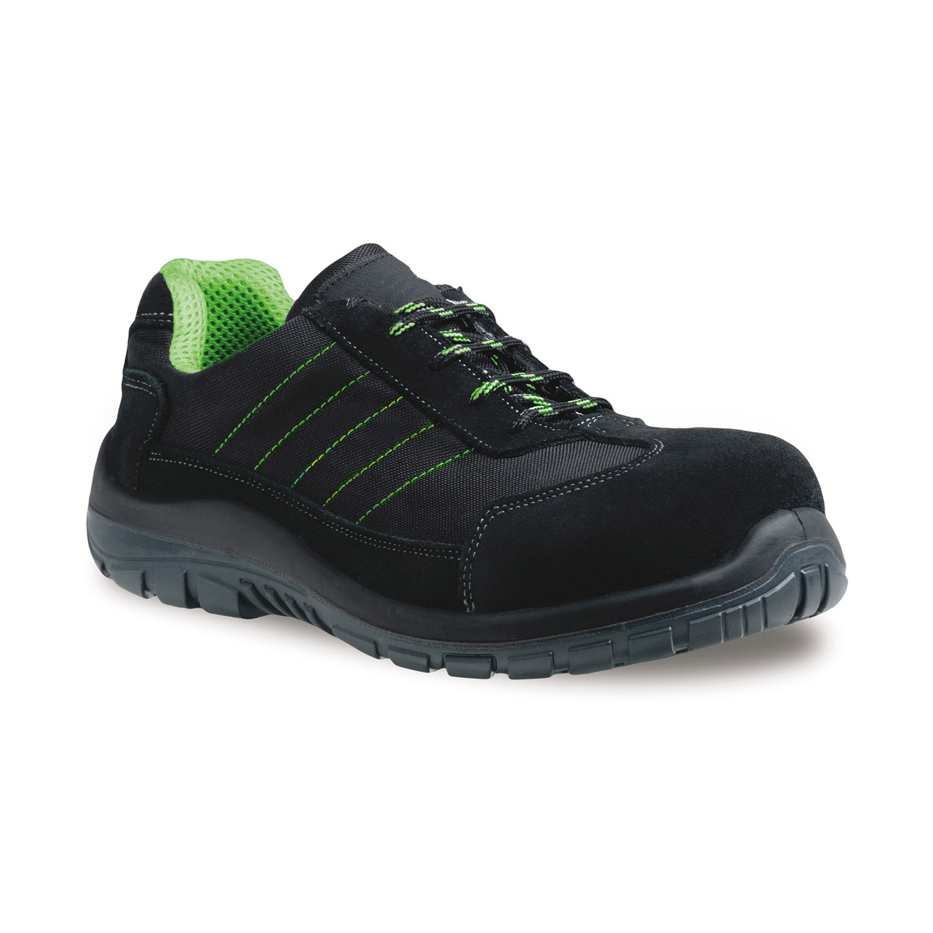 Scarpa protettiva bassa S1 P FO SRC, tipo sportivo in crosta bovina scamosciata con inserti retinati traspiranti.