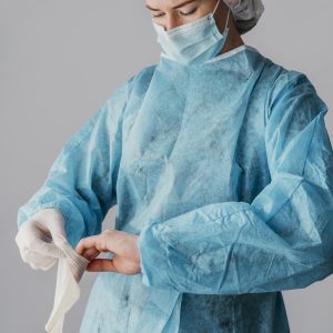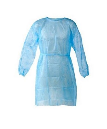 Camice monouso in TNT traspirante e filtrante, con allacciatura posteriore con elastico ai polsi.