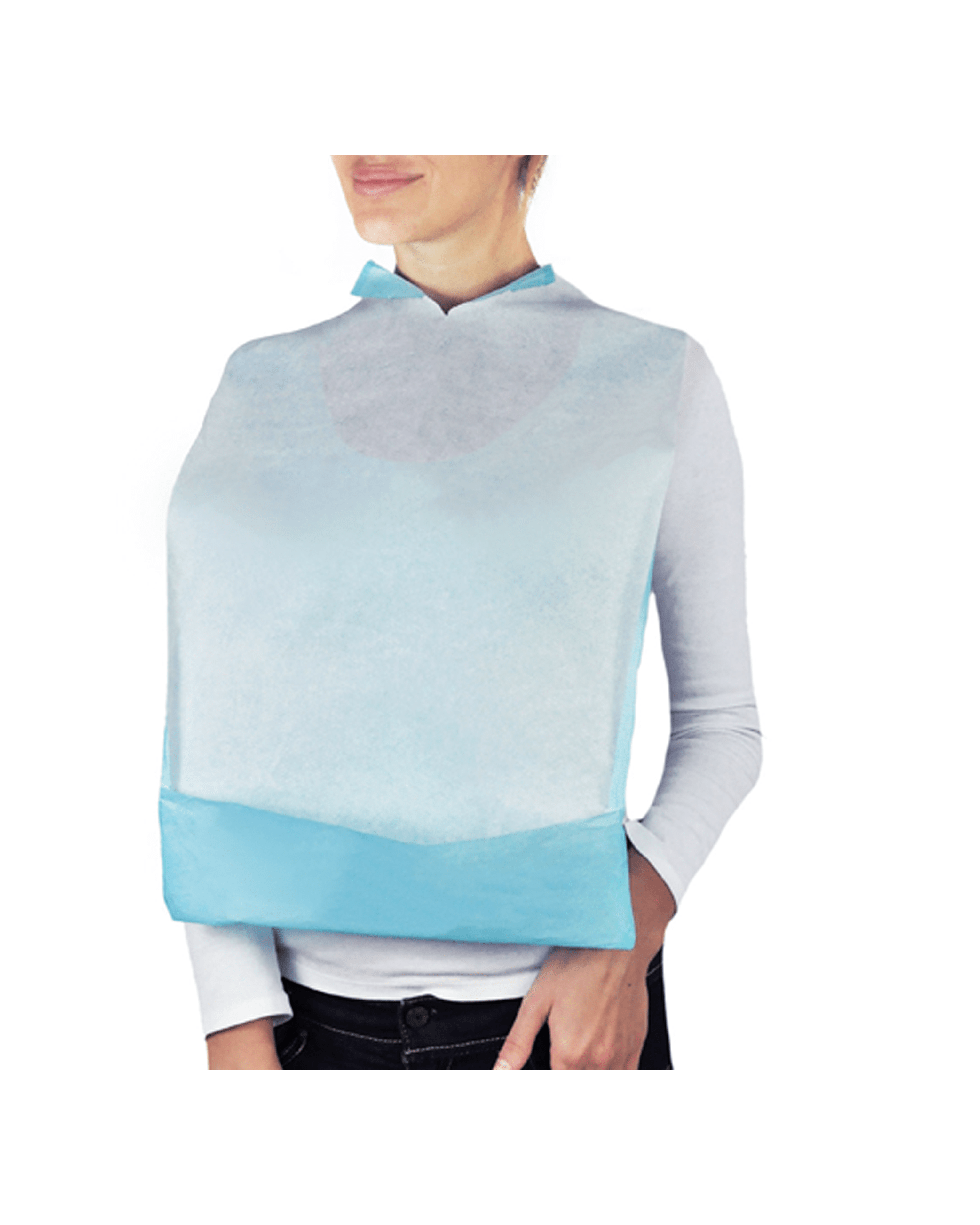 Bavaglio monouso polietinato in carta bianca, con tasca di raccoglimento.