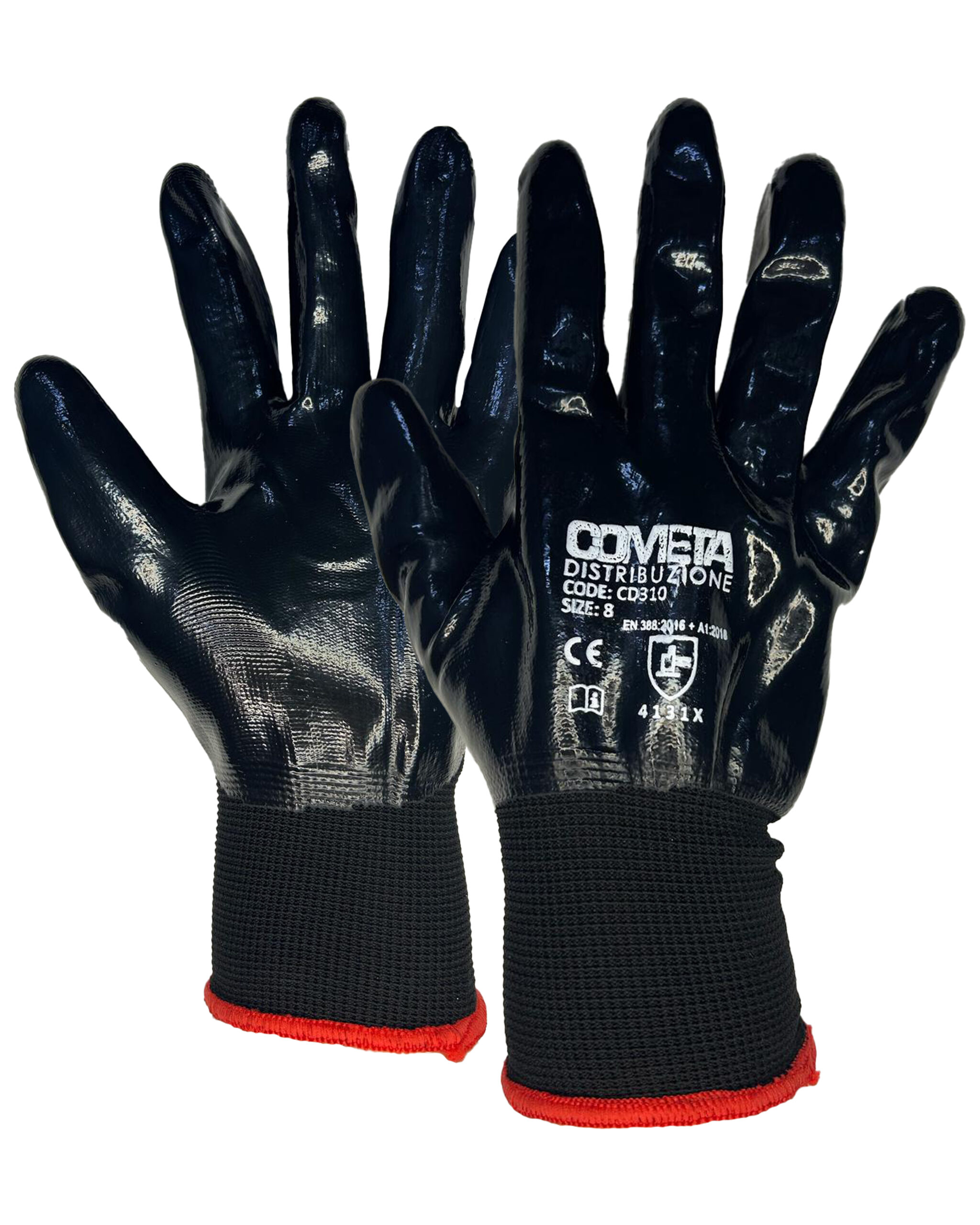 Guanto a filo continuo in 100% nylon, doppia spalmatura in nitrile, sabbiato su palmo, dita e dorso, polsino elastico e traspirante.