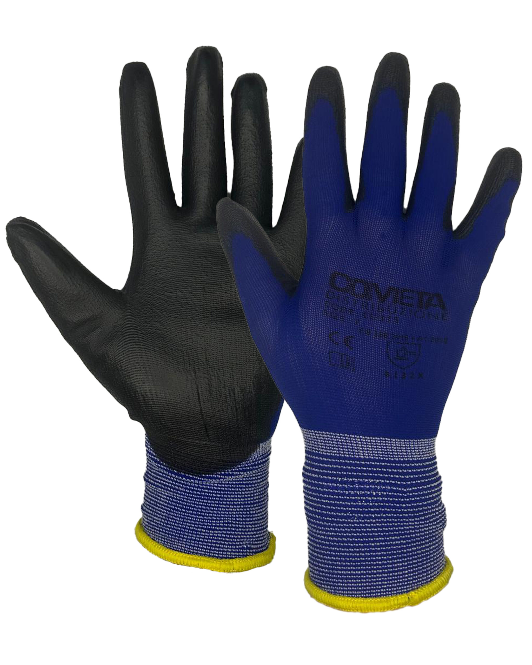 Guanto a filo continuo in nylon con spalmatura in poliuretano su palmo e dita, dorso traspirante e polsino elastico.