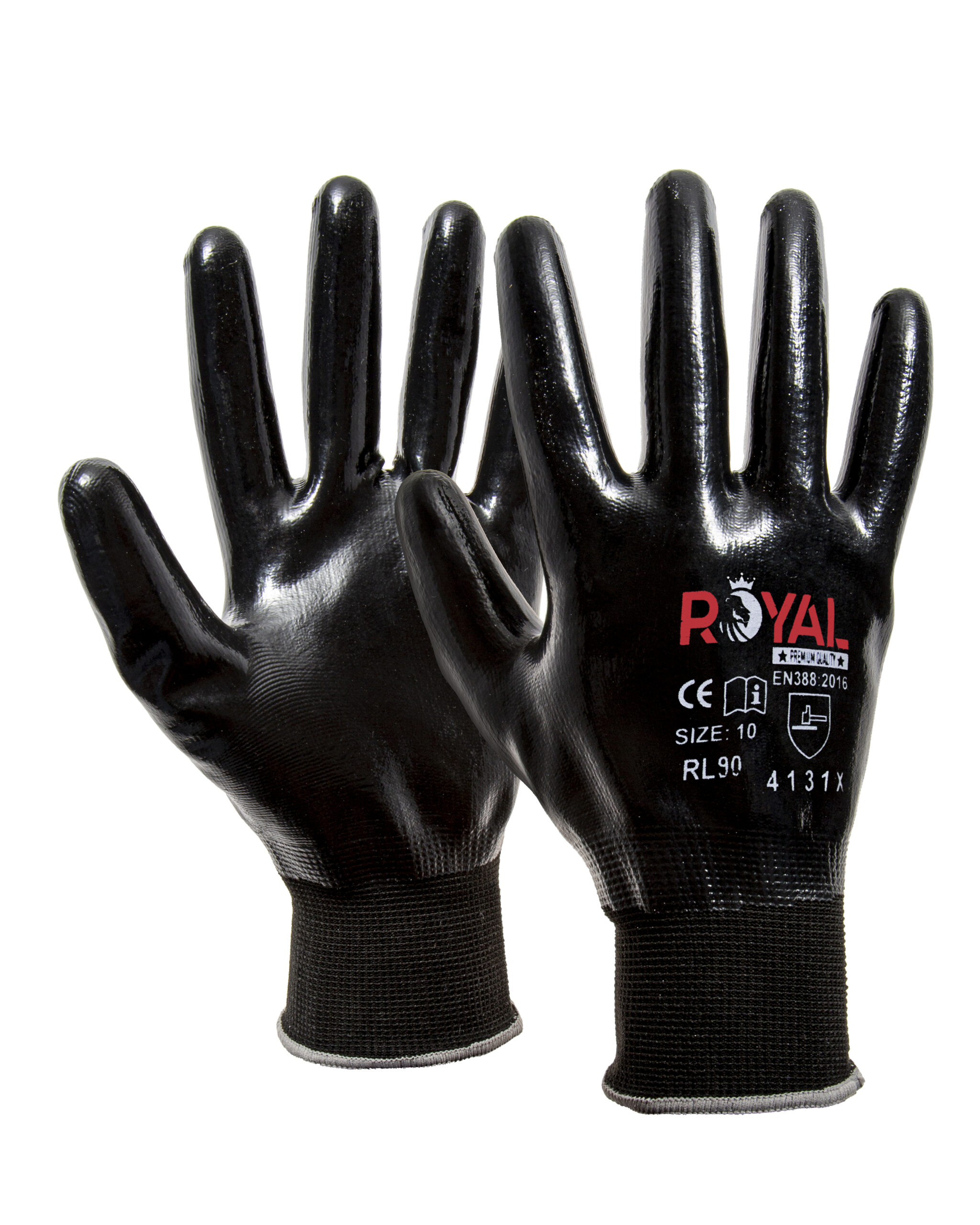 Guanto da lavoro “Royal Premium Quality” RL90 per l’antinfortunistica, conforme alla EN388 4131X. Realizzato a filo continuo in nylon e spandex. Doppia copertura totale in nitrile su dorso, palmo e dita. DPI di II categoria con marcatura CE.