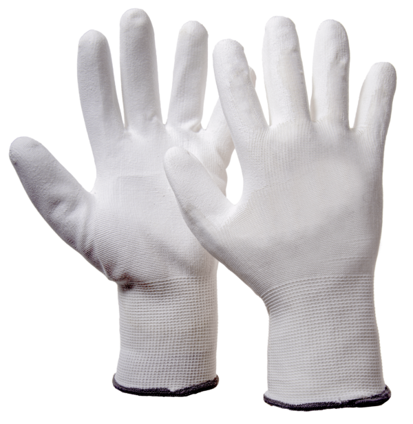 Guanto in filato continuo di poliestere, spalmatura in poliuretano su palmo e dita. Dorso traspirante e polsino elastico con bordatura.