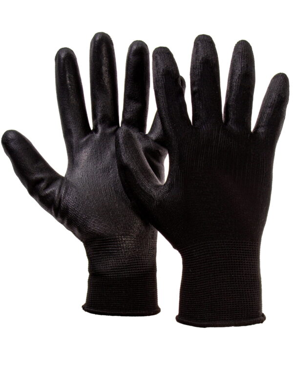 Guanto in filato continuo di poliestere, spalmatura in poliuretano su palmo e dita. Dorso traspirante e polsino elastico con bordatura.