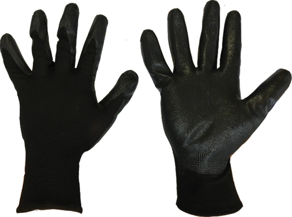 Guanto in filato continuo di poliestere, spalmatura in nitrile su palmo e dita, dorso traspirante e polsino elastico con bordatur.