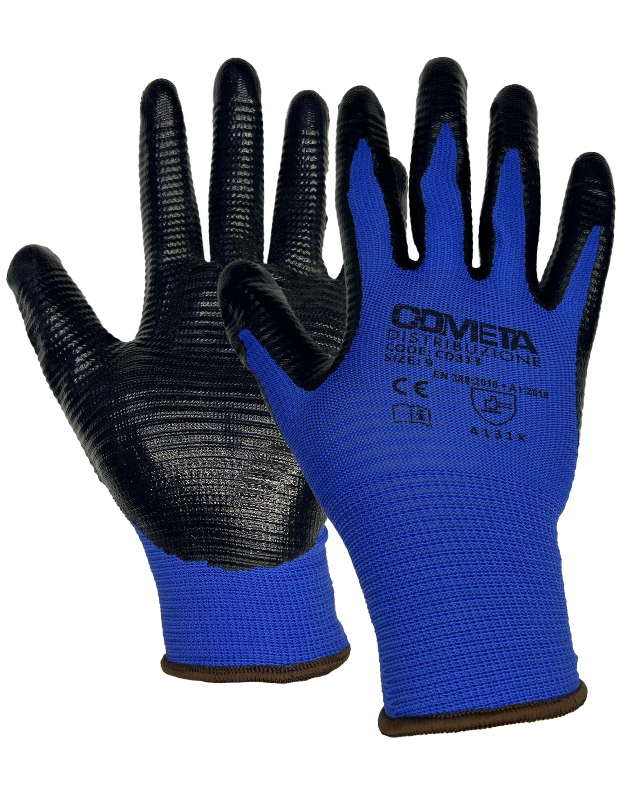 Guanto a filo continuo in nylon con spalmatura in poliuretano rigato su palmo e dita, dorso traspirante e polsino elastico.